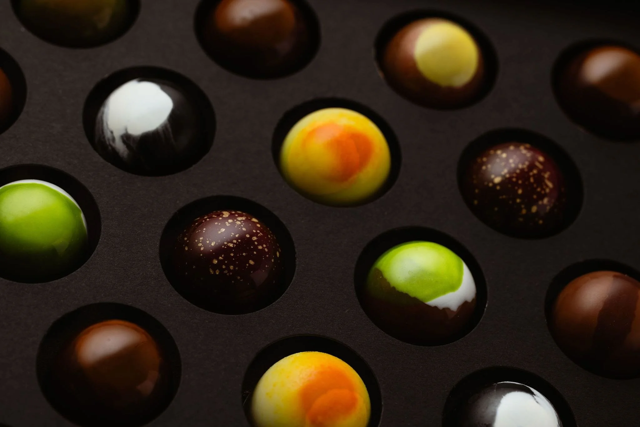 We work by hand with Chocolate from Felchlin. They've been making it in Switzerland for over 100 years. It is truly exceptional stuff. Kosher & Halal Certified too. We choose to shell our Individual Chocolates in a 55% Dark and 38% Milk Chocolate respectively. With the odd touch of White or Gold Choc where the recipe calls for it
